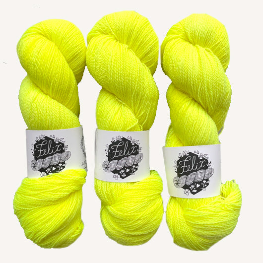 Felix består af 75% Falklands merino og 25% Corriedale uld. De to kvaliteter, kombineret med at der farves på en hvid base, giver en unik evne til at optage klare farver, og er det perfekte match til at give lidt ekstra farve til dit projekt strikket i det tilsvarende Helix garn fra La bien Aimée.