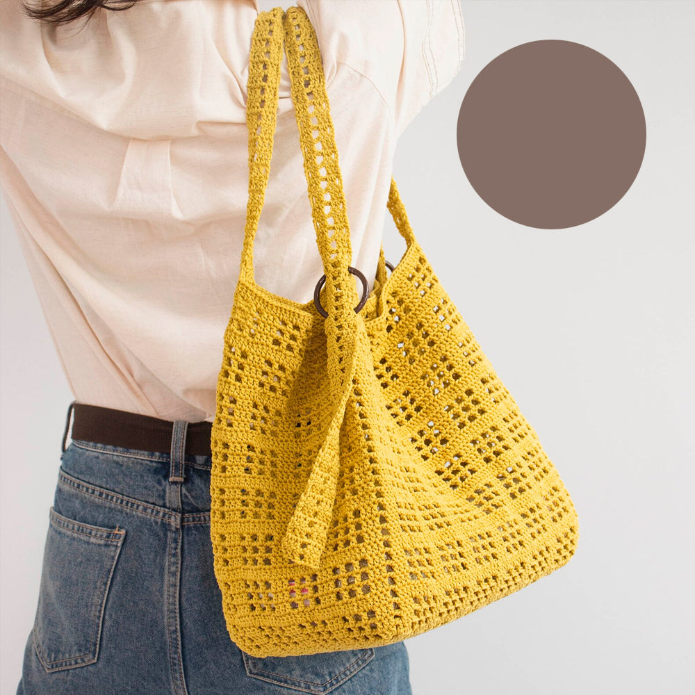 Olio Summer Big Bag er hæklet i Olio fra Yarn-a – et garn, vi selv har importeret fra Sydkorea, og som vi virkelig har glædet os til at introducere i Danmark.