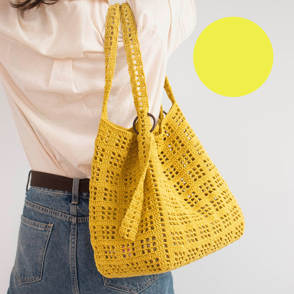Olio Summer Big Bag er hæklet i Olio fra Yarn-a – et garn, vi selv har importeret fra Sydkorea, og som vi virkelig har glædet os til at introducere i Danmark.