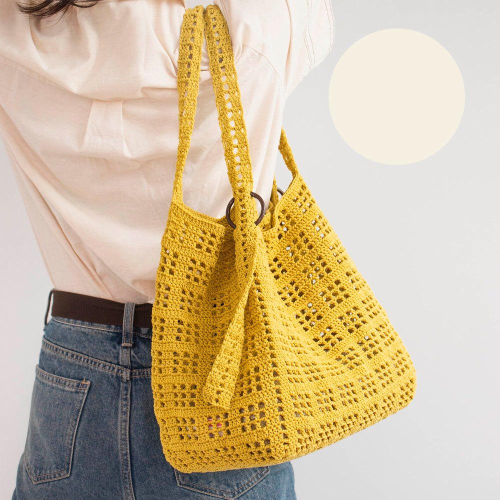 Olio Summer Big Bag er hæklet i Olio fra Yarn-a – et garn, vi selv har importeret fra Sydkorea, og som vi virkelig har glædet os til at introducere i Danmark.
