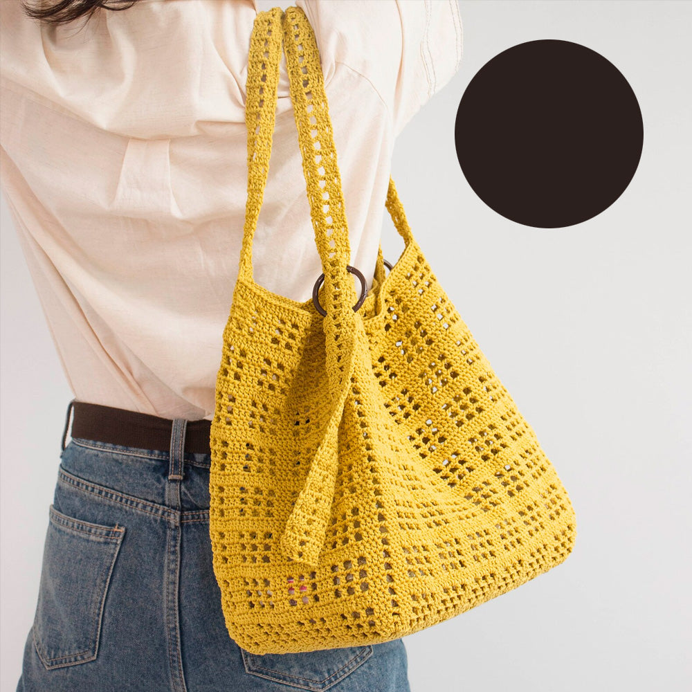 Olio Summer Big Bag er en rummelig taske hæklet i netmønster. Længden på taskens hanke justeres ved hjælp af to O-ringe, som er placeret i hvert sit hjørne.