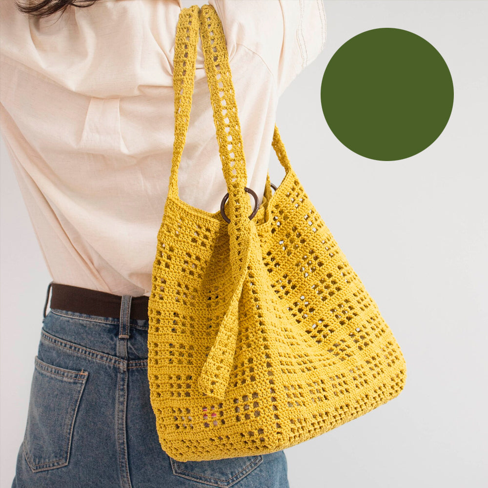 Kit med opskrift og garn til Olio Summer Big Bag i mørk oliven.