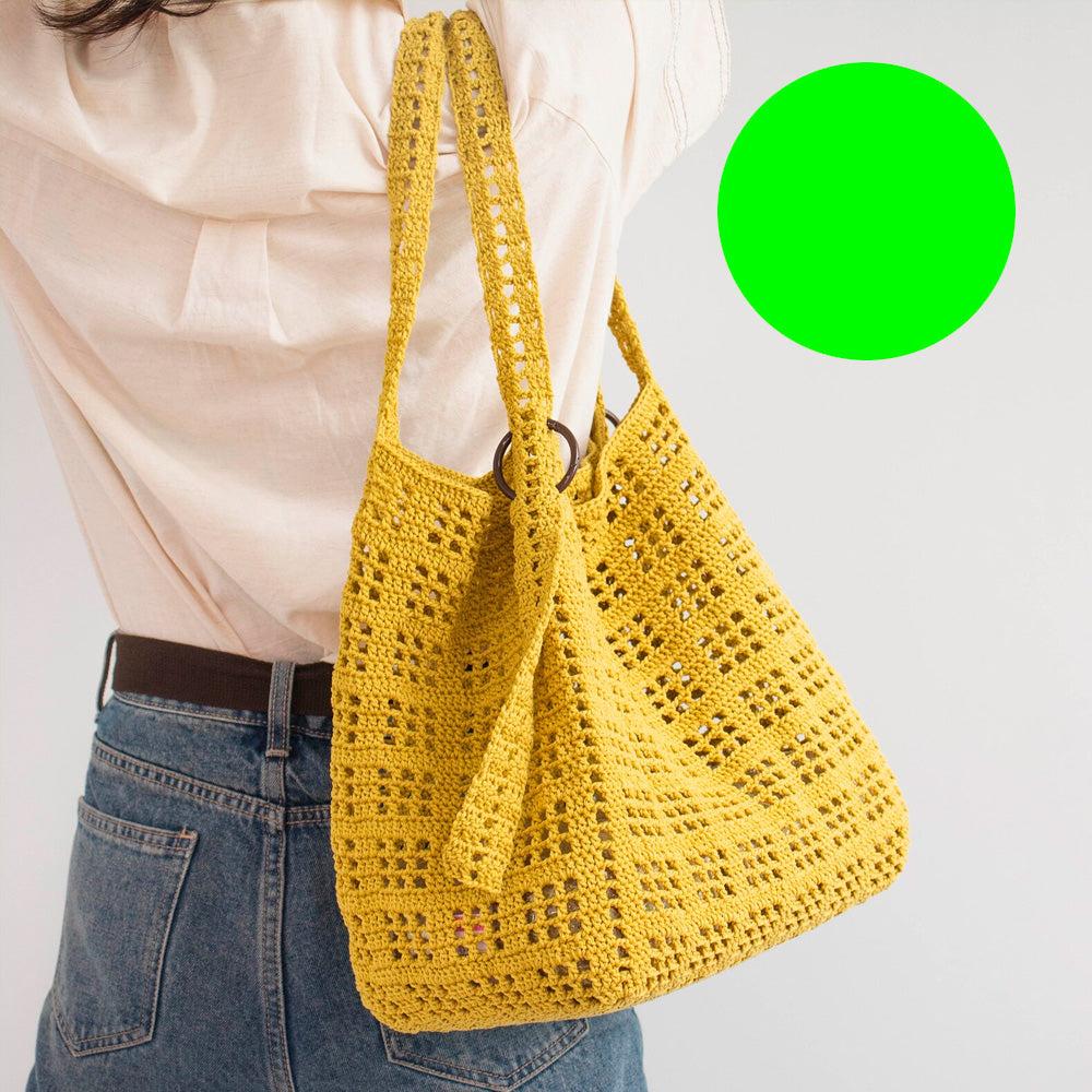 Olio Summer Big Bag er hæklet i Olio fra Yarn-a – et garn, vi selv har importeret fra Sydkorea, og som vi virkelig har glædet os til at introducere i Danmark.